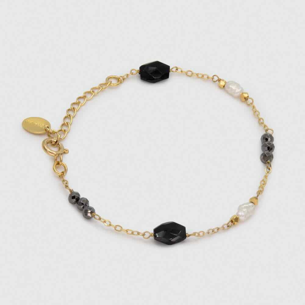 Armband van Une A Une met zwarte gefacetteerde stenen, donkere pyriet, parelmoer parels en gouden kleine kraaltjes. De armband is 18K (1 micron) goud verguld op messing. Lengte: 15+3cm.