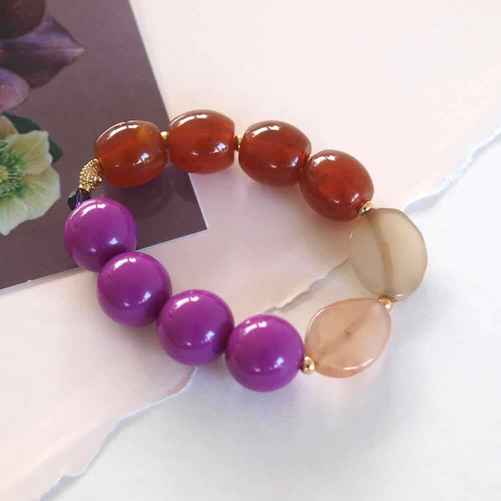 De armband is geregen op elastiek met 18mm paarse en bruine acryl kralen met natuurstenen kralen. De armband is wat groter, maar door de acryl kralen draagt de armband niet zwaar. Lengte: 18 cm, combineer de armband bij de ketting.