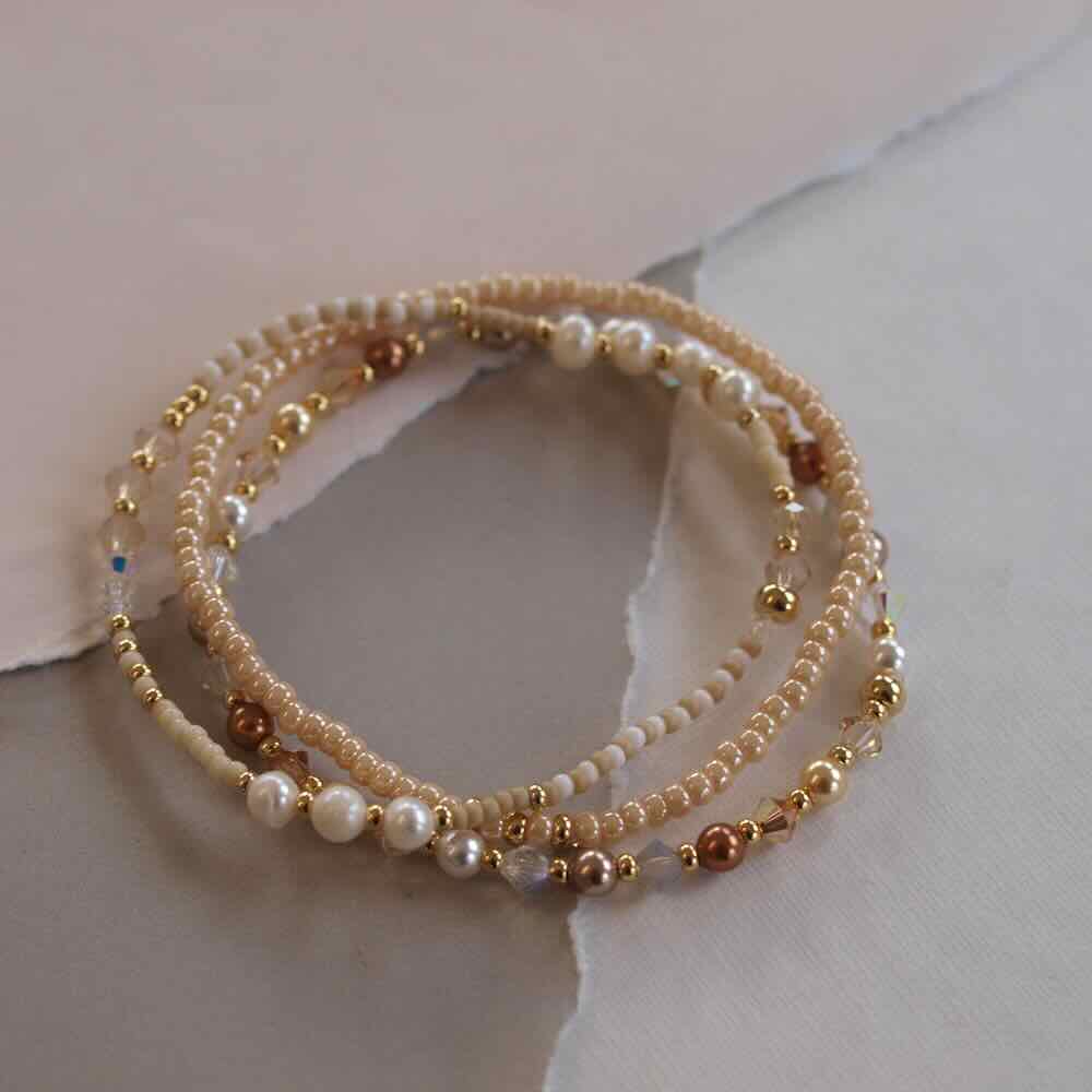 Widaro armbandset beige brown bestaat uit drie hele mooie armbanden die geregen zijn op elastiek. Een armband is miyuki kralen geregen, mooi in light beige. De tweede armband is geregen met hele mooie fijne miyuki kralen en zoetwaterpareltjes. De derde armband is prachtig met Swarovski kristallen parels en kralen geregen. De armbanden zijn op 18 cm geregen. Wil je graag een andere lengte, stel je vraag hieronder of mail ons.