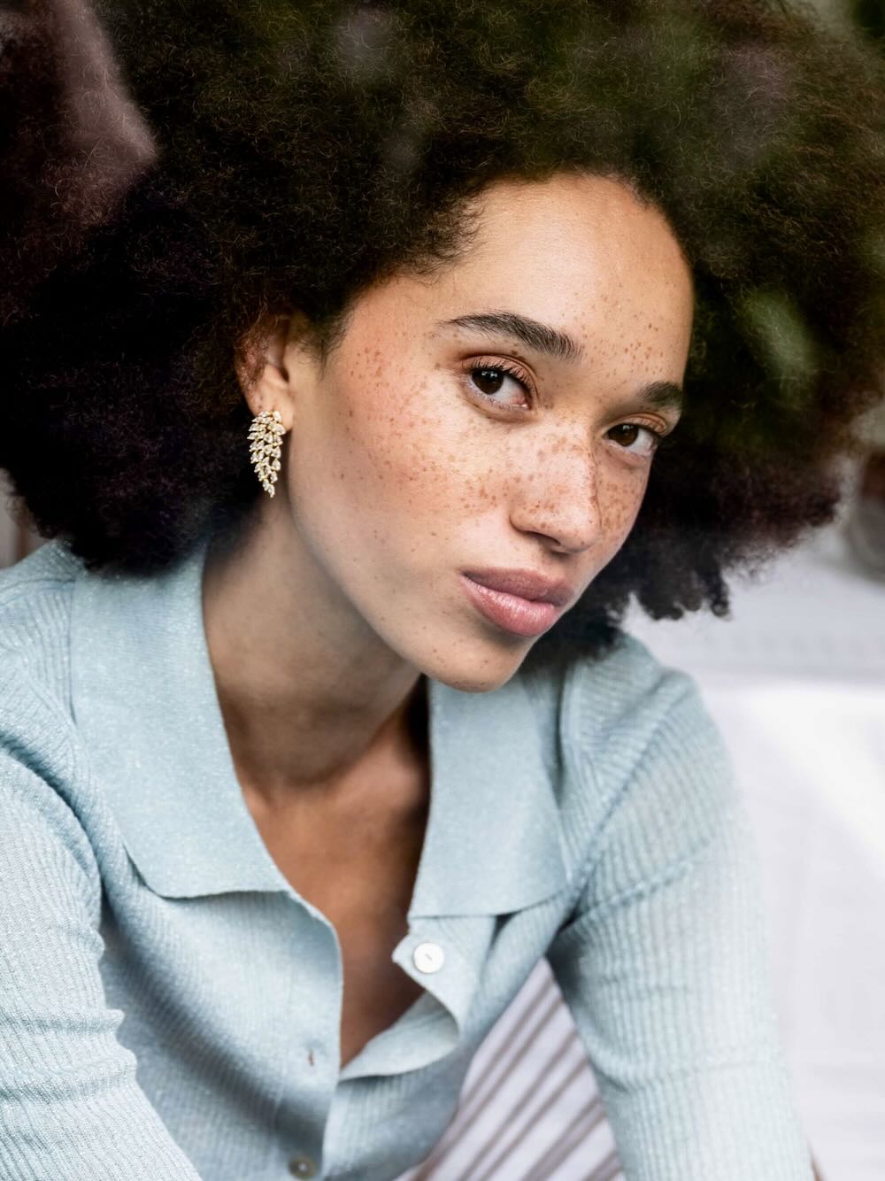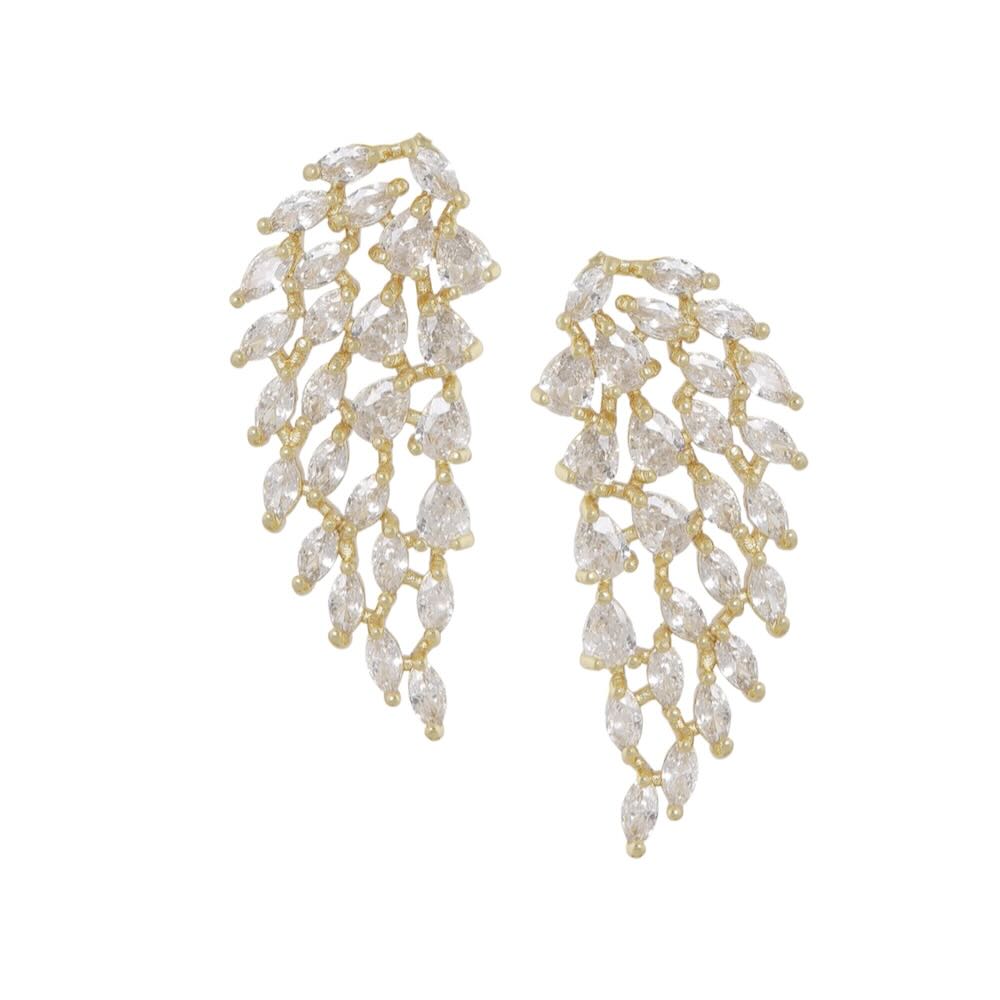 Oorbellen van Ellen Beekmans in de vorm van een blad met doorzichtige strass steentjes. De oorbellen zijn verguld op longlasting stainless steel. Lengte: 3,3 cm.