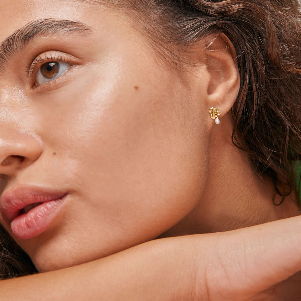 Oorbellen van Enamel copenhagen 18k goud verguld. De oorbellen hebben gouden oorstekers met een gehamerd effect en mooie kleine zoetwaterpareltjes als hangers. Zo stijlvol en verfijnd zijn deze oorbellen. Lengte: 1 cm