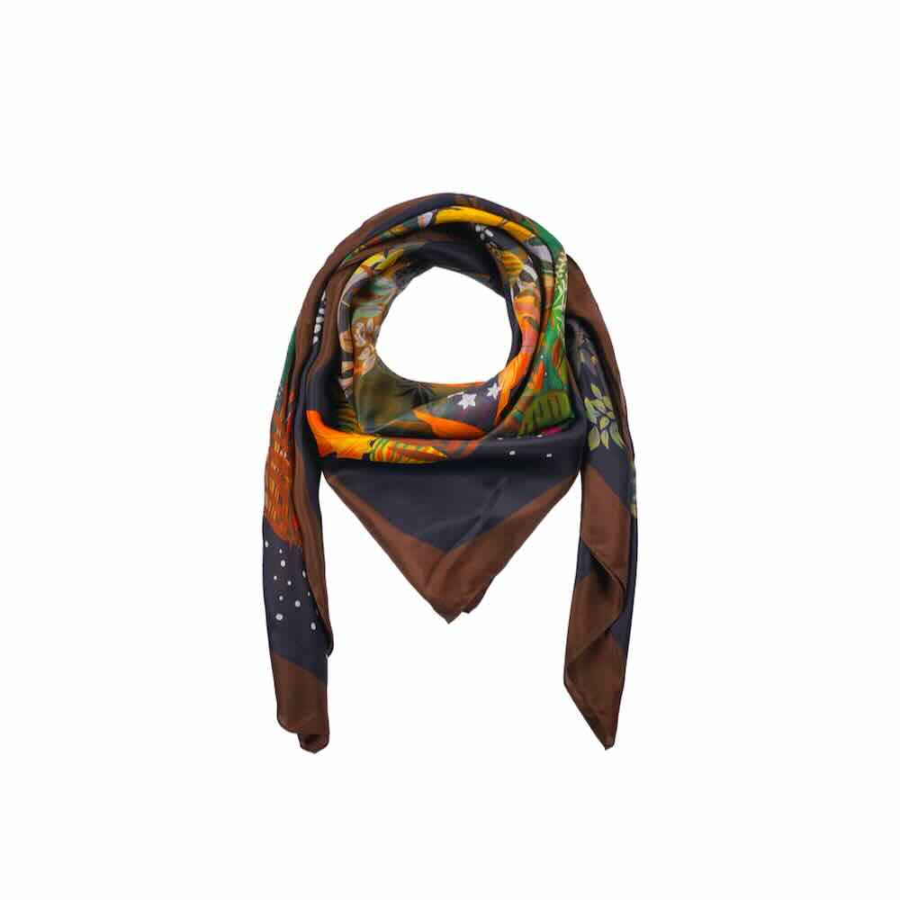 De sjaal van Wild paris met een print van een bloemrijk landschap. De sjaal heeft een bohemian uitstraling en is 130 bij 130 cm en is gemaakt van 100% zijde. De sjaal kun je dragen om je hals of in je haar als haarband.