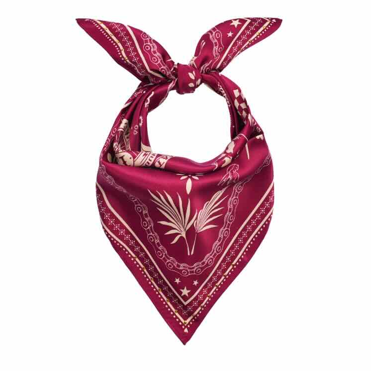 De vierkante sjaal van Wild paris met een biker print waar je de motor ziet en de race vlaggen, maar je ziet ook de vrouwelijke touch op de sjaal met de bloemen, sterretjes en hartjes. De sjaal heeft een bohemian uitstraling en is 55 bij 55 cm en is gemaakt van 100% gerecycled polyester. De mini burgundy is echt een musthave sjaal voor de herfst.