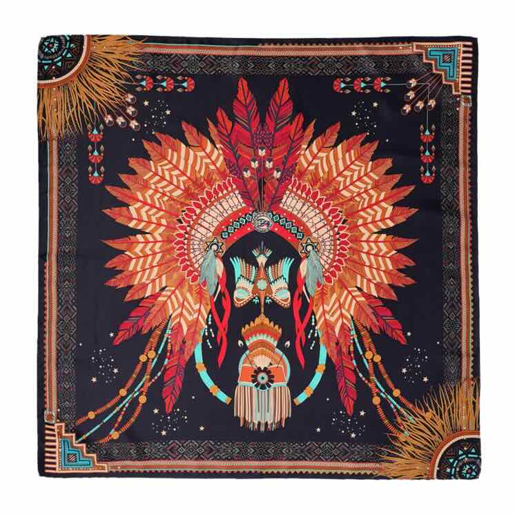 De vierkante sjaal van Wild paris met een indianen print waar een indianen hoofdtooi in het midden staat met de tribale symbolen op de punten van de sjaal. De kenmerken van Wild komen in deze sjaal echt naar voren met de sterren en veren langs de randen. De sjaal heeft een bohemian uitstraling en is 55 bij 55 cm en is gemaakt van 100% gerecycled polyester. De mini new western sjaal in black is prachtig.