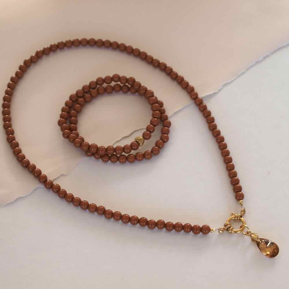 Ketting geregen met 6mm acryl kralen in de mooie kleur cognac brown. De ketting draagt heel fijn licht en heeft nog een mooi roestvrijstalen sluiting waar je bedels aan kunt hangen. We kunnen de ketting ook met een zilveren sluiting maken. De ketting wordt zonder bedel geleverd. Lengte: 46 cm, de ketting is dus ook heel mooi met de bedel sparkle drops in gold.