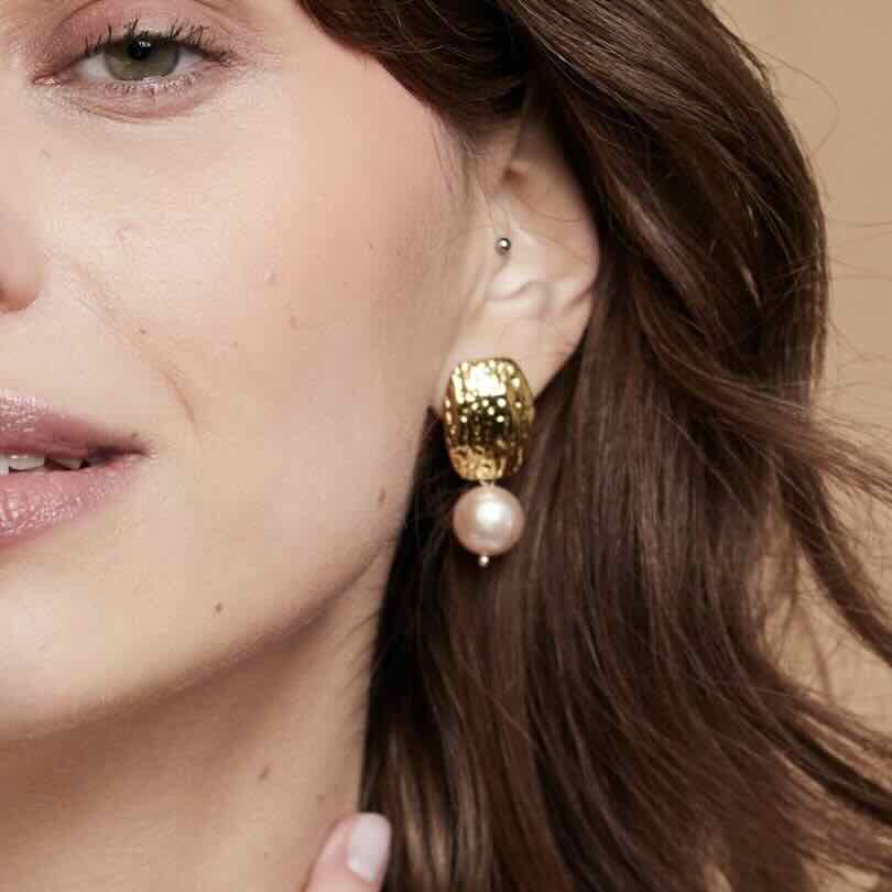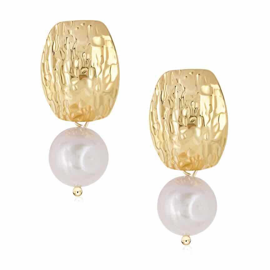 Oorbellen van Ellen Beekmans met gehamerde stekers en een grote zoetwaterparel. De oorbellen zijn verguld op longlasting stainless steel. Let op! Ze zijn niet helemaal wit. Lengte: 3,5cm.