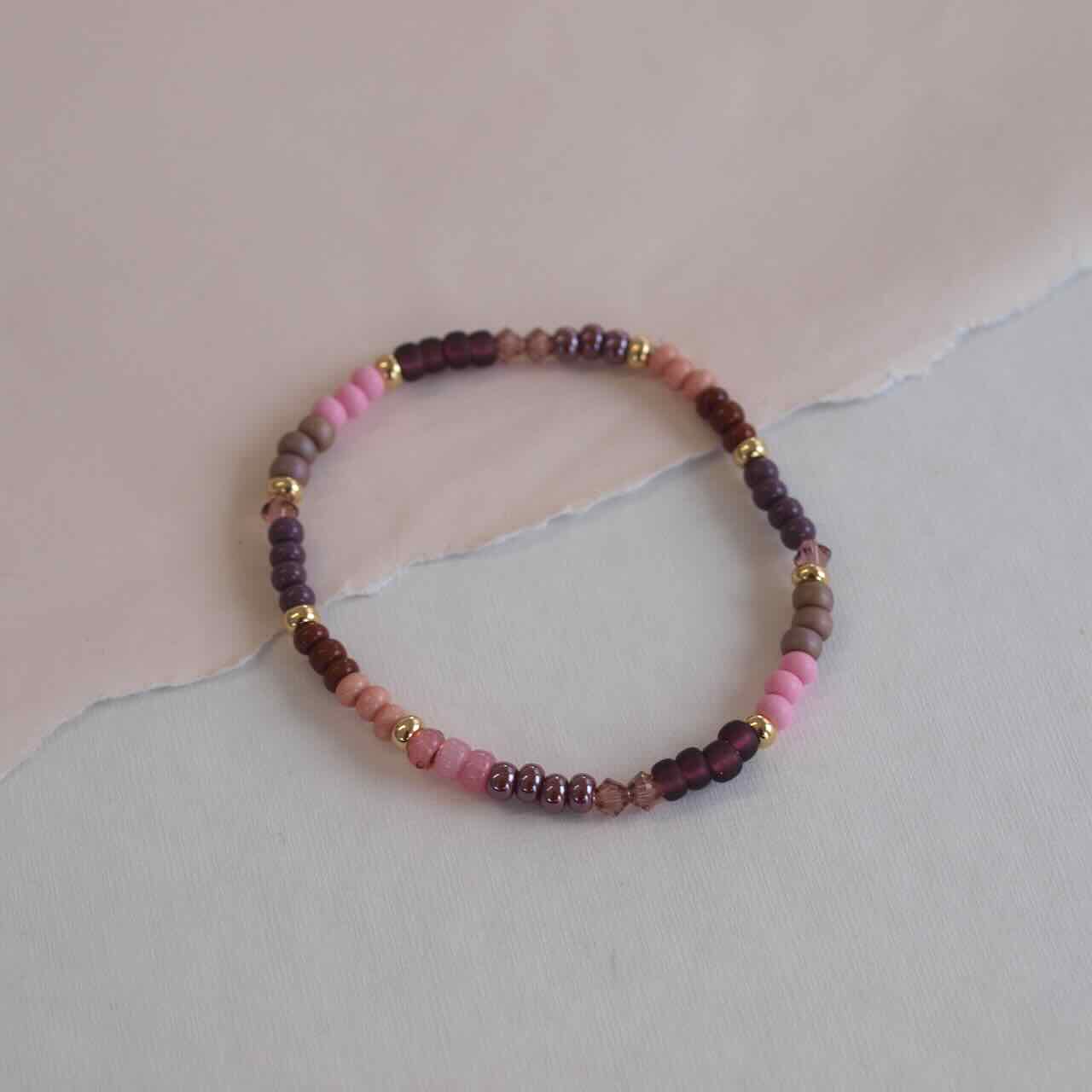 De armband more lots of pink is geregen met rocailles in 6/0 in paars, roze, bordeaux en met kristallen kraaltjes. Lengte: 18cm ,wil je graag een andere maat stel je vraag hieronder of mail ons. Combineer met dezelfde ketting.