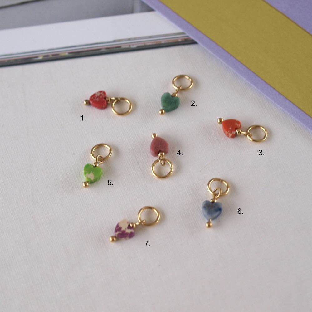 Bedeltjes met mooie kleine natuurstenen hartjes in leuke kleuren. De bedeltjes zijn gemaakt met een roestvrijstalen ringetje zodat je de hartjes leuk aan je creolen of ketting kunt dragen. Lengte: 2cm, voor welke kleur ga jij? let op: De bedeltjes kunnen wat verschillen qua kleur.