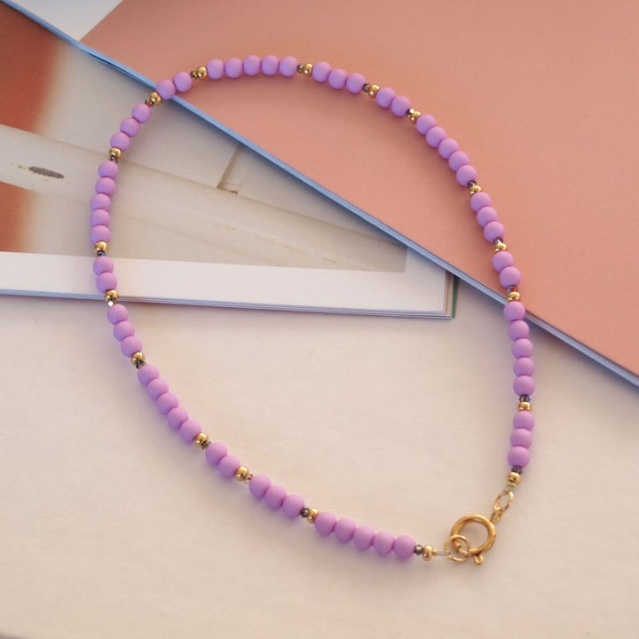 Ketting van de Widaro collectie geregen met acryl kralen in drie leuke kleuren; fuchsia, oranje en olijf. In de ketting zijn gouden rocailles en kristallen kralen mee geregen voor een nog mooier effect. De ketting heeft een gouden roestvrij stalen sluiting wat ook naar voren gedragen kan worden met een bedel naar keuze. Lengte: 42cm.