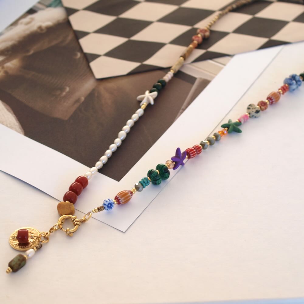 Halflange ketting geregen met mooie glaskralen, zoetwaterparels, rocailles en keramieken zeesterren en natuurstenen kralen. De ketting heeft een roestvrijstalen boeislot en bedels, zoals een roestvrijstalen munt en fun bedels. Lengte: 65 cm