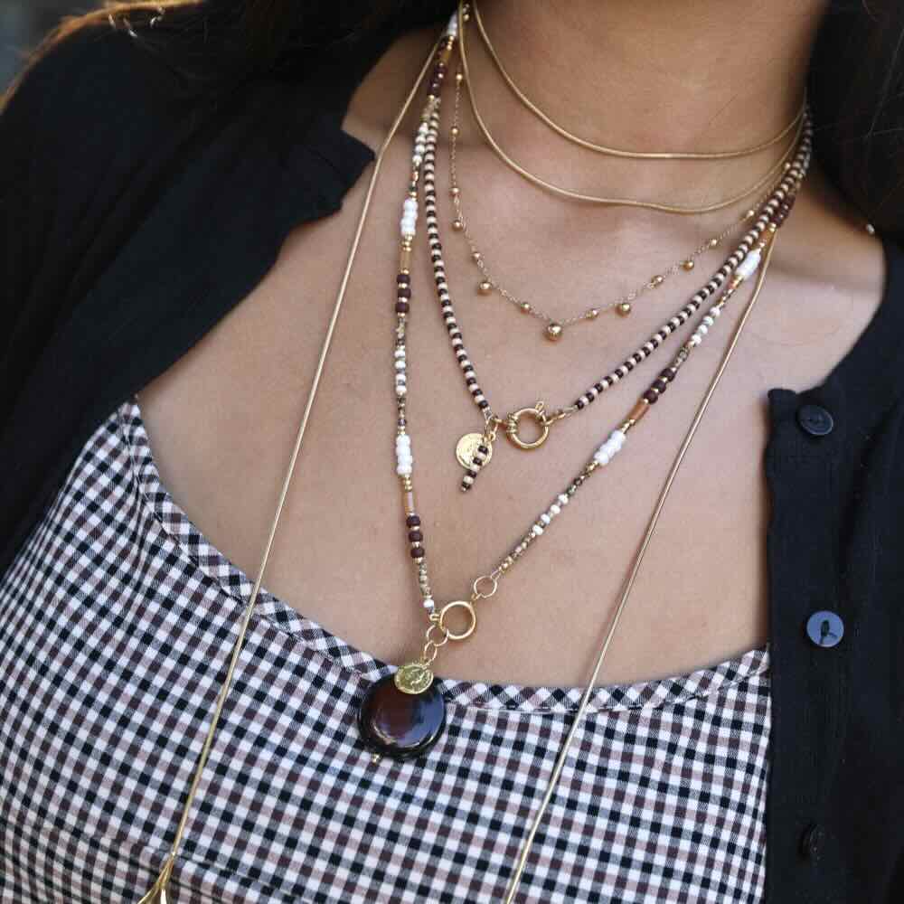 De widaro kralen ketting stripey dark brown is geregen met miyuki kralen in beige en donkerbruin en heeft een roestvrijstalen sluiting. Aan de ketting hangen al twee mooie bedels, zoals het vergulde muntje en het kralen bedeltje. Lengte: 49cm, de ketting is stijlvol om alleen te dragen, maar ook leuk om nog te combineren met meer kettingen.