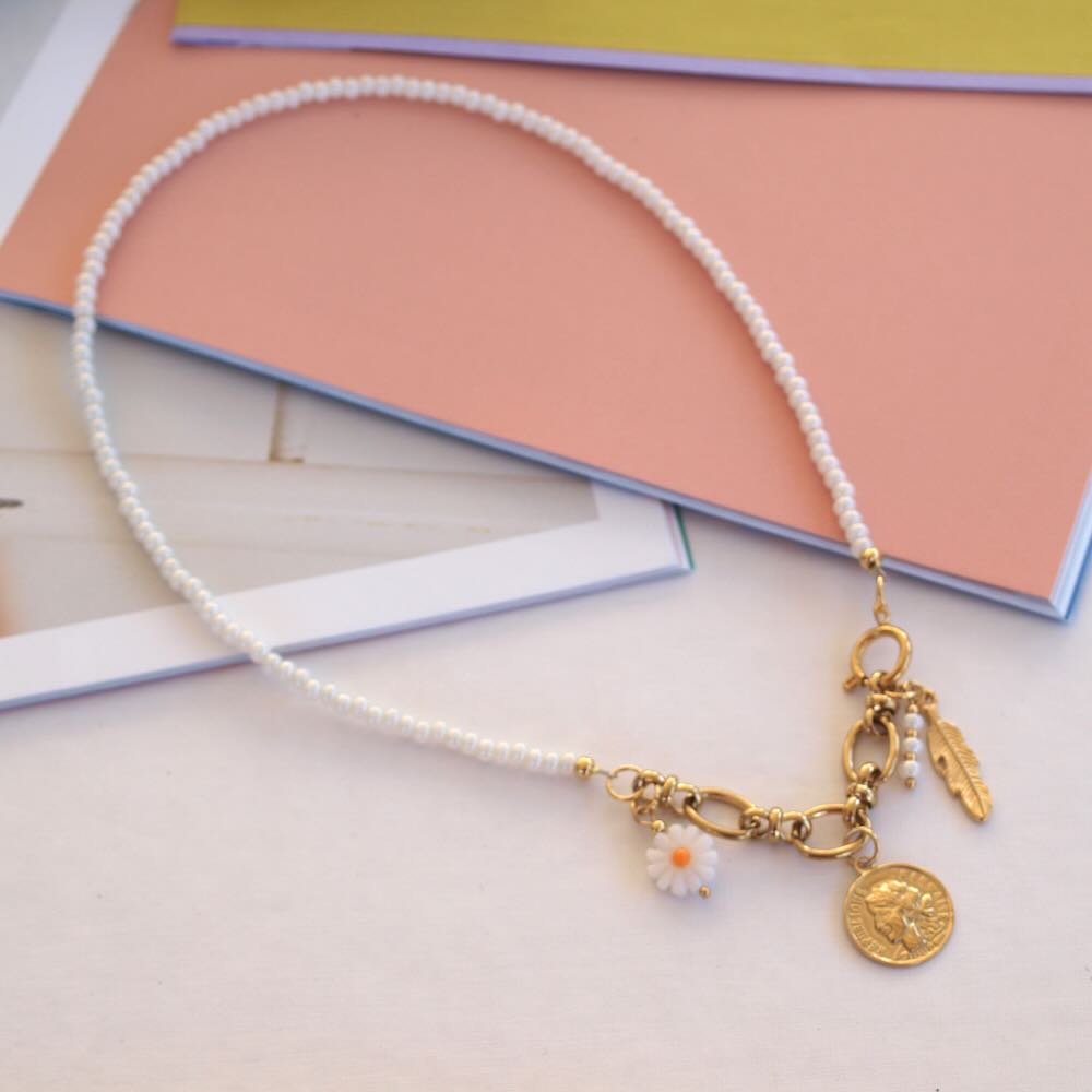 Ketting geregen met rocailles en een stukje gouden chain ertussen. Daar hangen verschillende mooie bedels aan, zoals de munt en de veer. De ketting kan je op twee manieren dragen, rond met de chain in het midden of de chain als sliert naar beneden. Helemaal leuk toch! De sluiting en de sluiting zijn van roestvrijstaal. Lengte: 47 cm met chain rond, 41 cm kort met sliertje