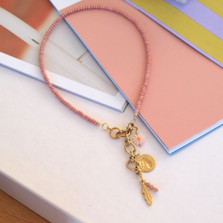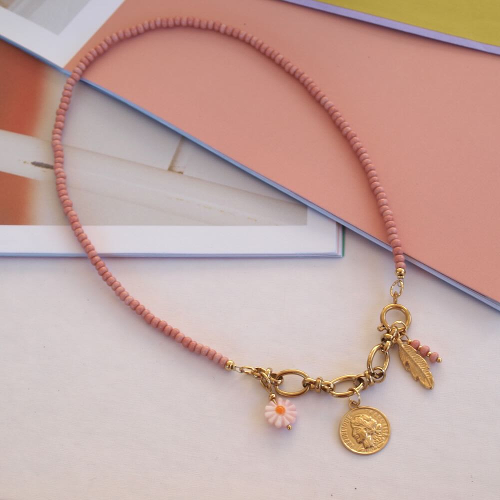 Ketting geregen met rocailles en een stukje gouden chain ertussen. Daar hangen verschillende mooie bedels aan, zoals de munt en de veer. De ketting kan je op twee manieren dragen, rond met de chain in het midden of de chain als sliert naar beneden. Helemaal leuk toch! De sluiting en de sluiting zijn van roestvrijstaal. Lengte: 47 cm met chain rond, 41 cm kort met sliertje.