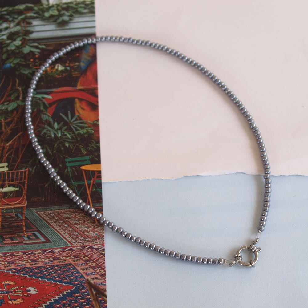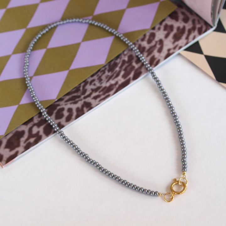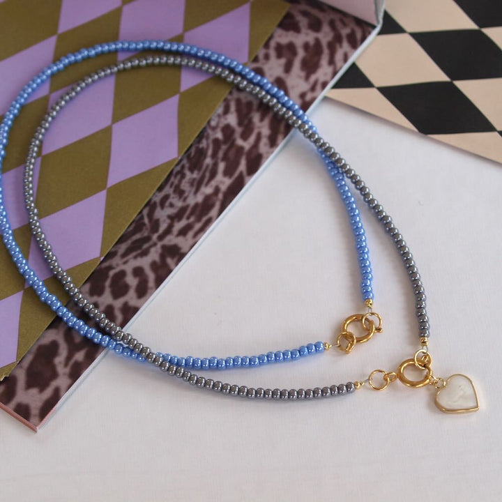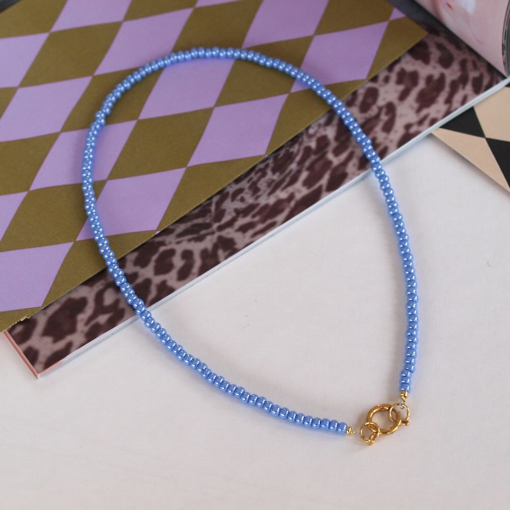 Ketting geregen met 6/0 rocailles in twee mooie kleuren, de baby blue en grey. De kettingen hebben een gouden roestvrijstalen sluiting. Draag de sluiting naar voren en kies nog leuke bedels voor aan je ketting. De ketting is ook mogelijk met een zilveren roestvrijstalen sluiting. Lengte:44 cm