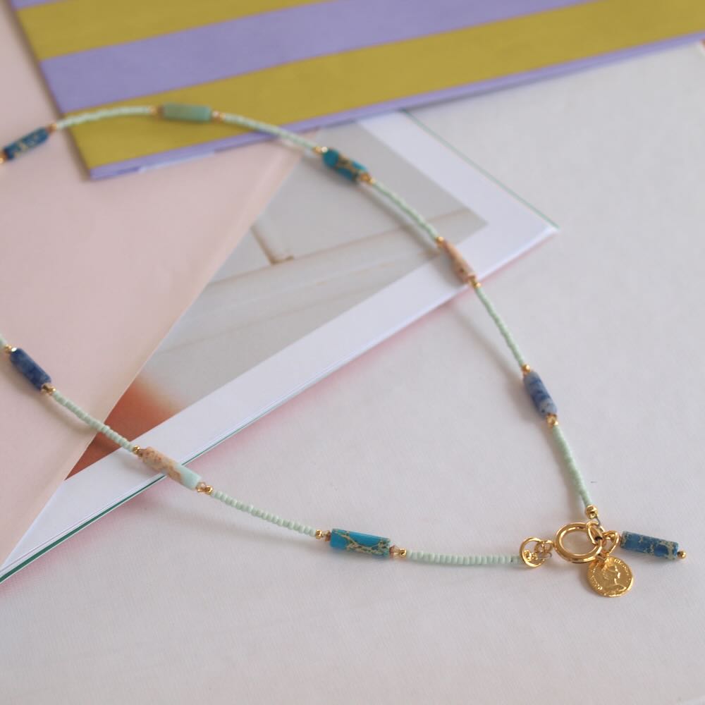 Ketting geregen met kleine mintkleurige miyuki kralen en mooie blauwe natuurstenen tube kralen. De ketting heeft een gouden roestvrijstalen sluiting met 2 bedels, een muntje en tube kraal. Lengte: 49 cm. Combineer de ketting een kortere ketting of een gouden chain. Er is ook een armbandje bij.