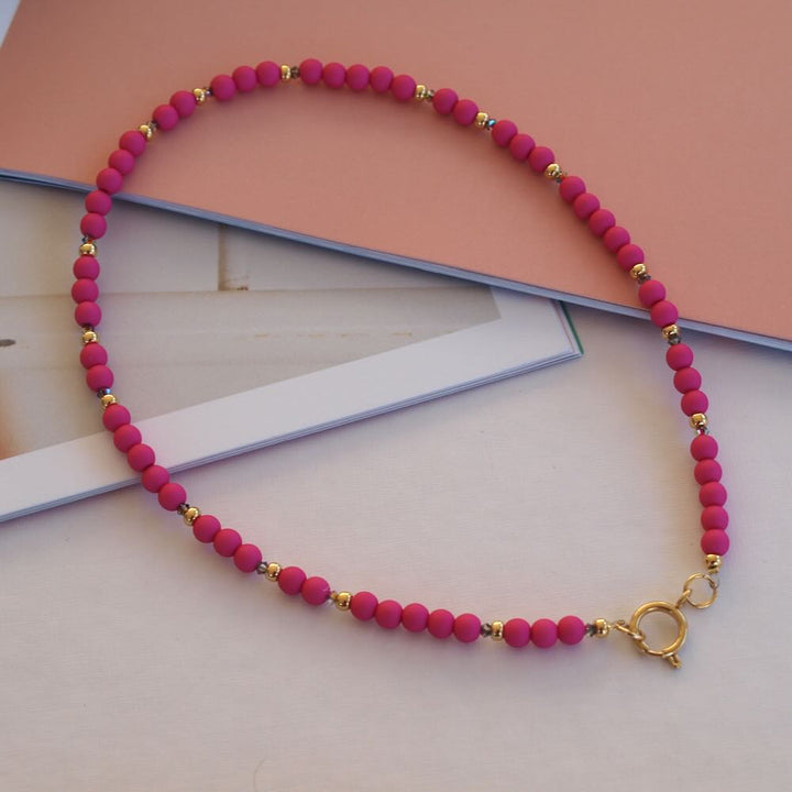 Ketting van de Widaro collectie geregen met acryl kralen in drie leuke kleuren; fuchsia, oranje en olijf. In de ketting zijn gouden rocailles en kristallen kralen mee geregen voor een nog mooier effect. De ketting heeft een gouden roestvrij stalen sluiting wat ook naar voren gedragen kan worden met een bedel naar keuze. Lengte: 42cm.