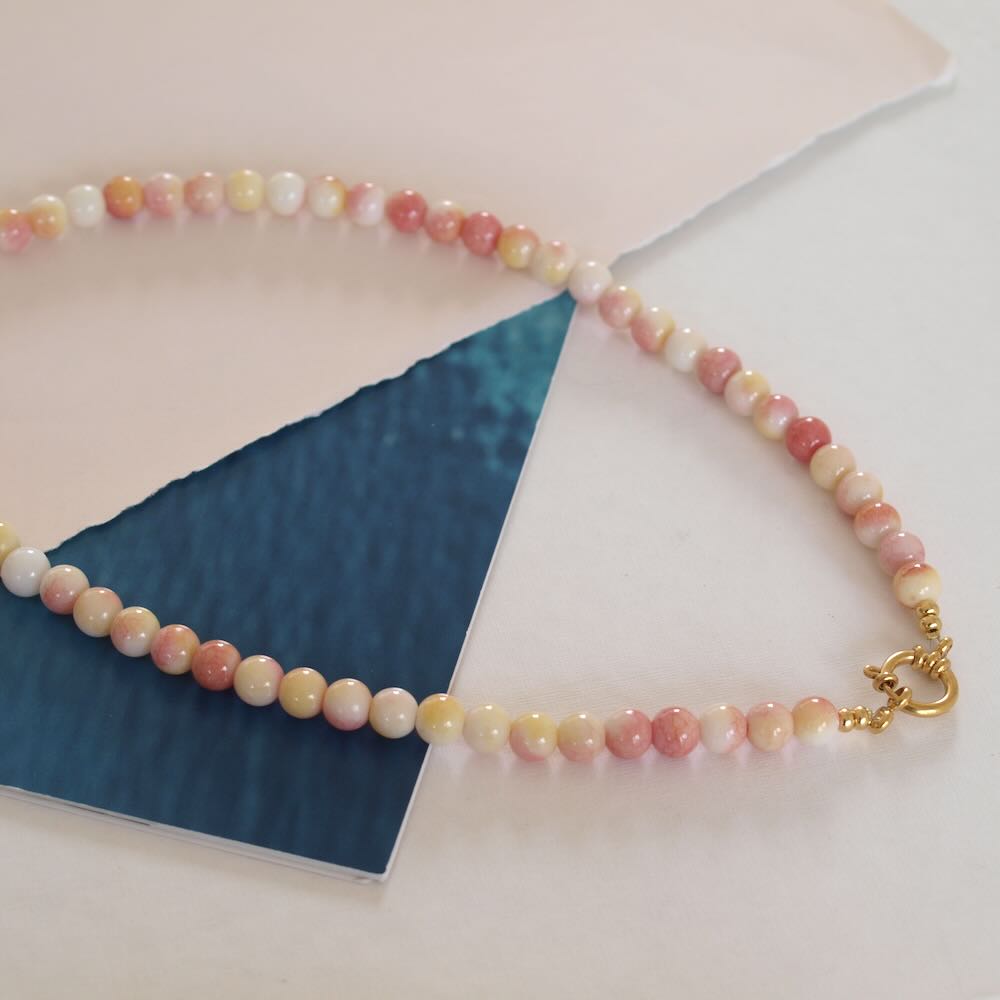 Ketting van Widaro geregen roze en geel marmer kleurige kralen. De sluiting is van roestvrijstaal en daar kan nog een leuke bedel aangehangen worden. De ketting kan ook in het zilver geregen worden. Leuk te combineren met de armband. Lengte: 49cm