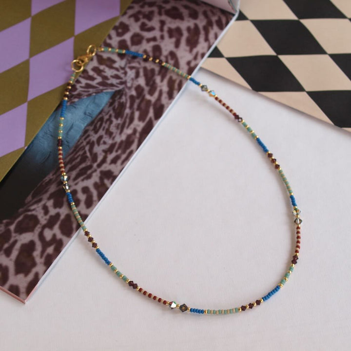 Ketting geregen met kleine miyuki kralen, gouden 24k vergulde rocailles en kleine kristallen kraaltjes in mooi blauw, beige en donkerrood. Lengte: 43 cm. De ketting heeft een roestvrijstalen gouden sluiting. Draag de halflange ketting blue and a touch of naturals erbij en er is ook nog een bijpassende armband en ring bij!