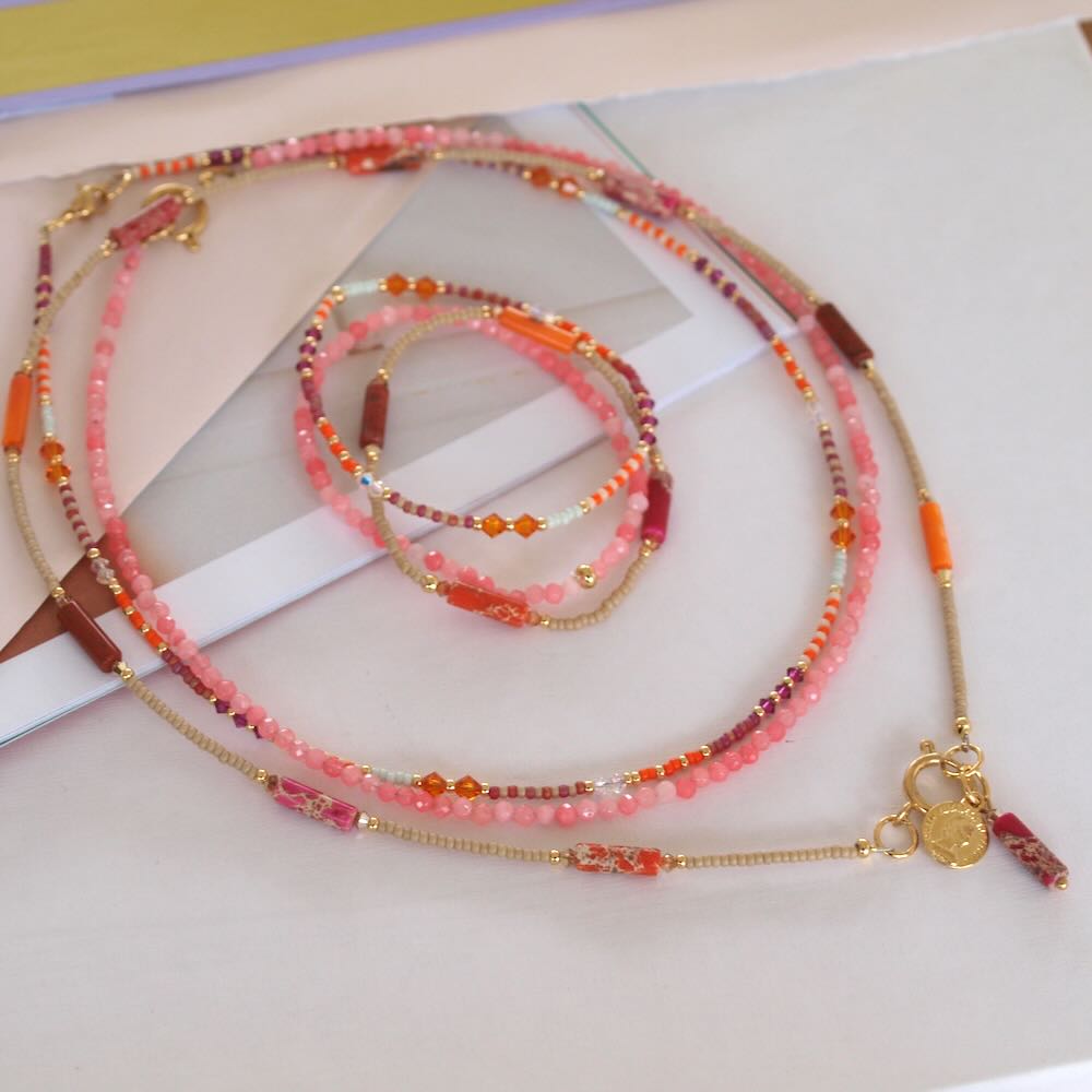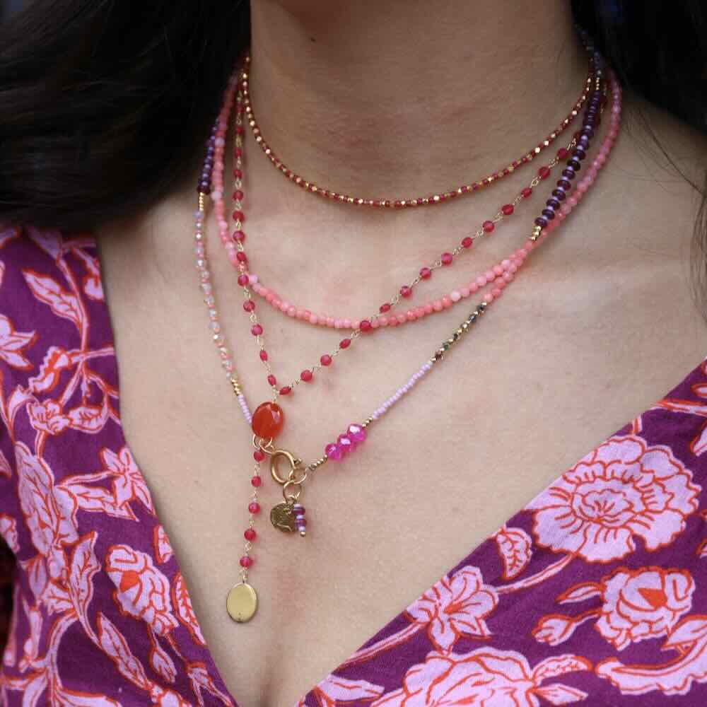 Ketting geregen met facet geslepen kralen in de mooie kleur roze. De ketting is 44 cm zodat je deze ook met langere kettingen kunt combineren. De ketting heeft ook een mooi gouden roestvrijstalen sluiting die je naar voren kunt dragen. Wil je de ketting graag met een zilveren sluiting, dan kunnen we die voor je rijgen. Je kunt ook nog bedels aan je ketting kiezen. Combineer met dezelfde armband.