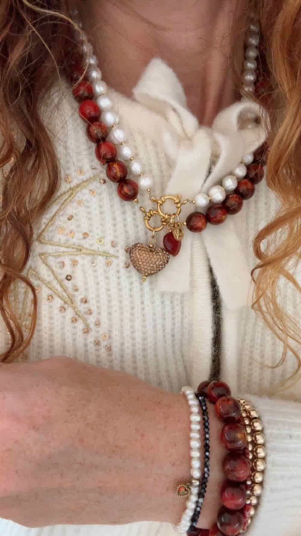 Ketting red brown is geregen met 12mm resin kralen met een glans van rood, bruin en goud. De ketting is niet zwaar en heeft een mooie roestvrijstalen sluiting. Je kunt kiezen uit een gouden of zilveren boeislot. De ketting kun je met de sluiting naar voren dragen en er nog mooie bedels aan hangen. De ketting is ook iets langer, lengte 51 cm. Wil je graag een andere lengte stuur ons dan een mail of stel je vraag hieronder. Combineer met dezelfde armband. De ketting wordt zonder bedel geleverd. Op de foto zie je ook nog de widaro parelketting gold 8mm of de sweet round pearls ketting.