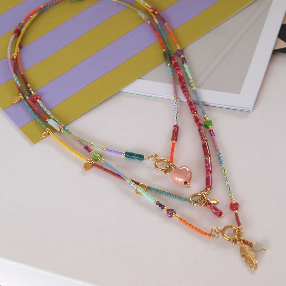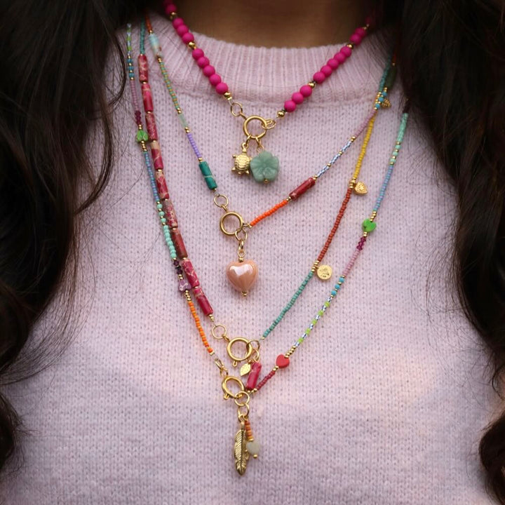 Ketting van de Widaro collectie geregen met rocailles, natuursteen tubes en leuke goudkleurige bedeltjes. Aan de ketting hangt al een peach keramieken hart als bedel. De ketting heeft een roestvrijstalen sluiting. De lengte is 62cm.