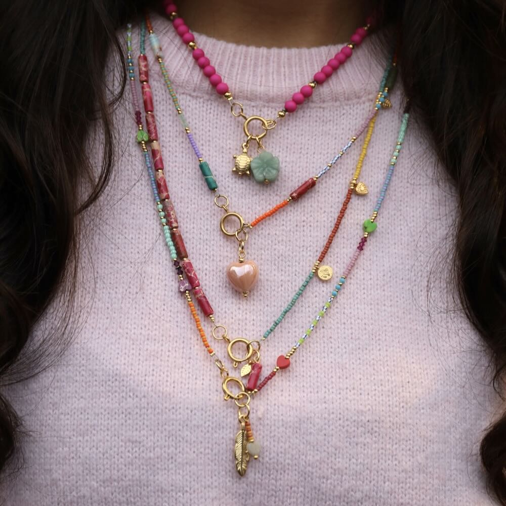 Ketting van de Widaro collectie geregen met rocailles, natuursteen tubes en glaskralen. Aan de ketting hangt al een peach keramieken hart als bedel. De ketting heeft een roestvrijstalen sluiting. De lengte is 52cm.