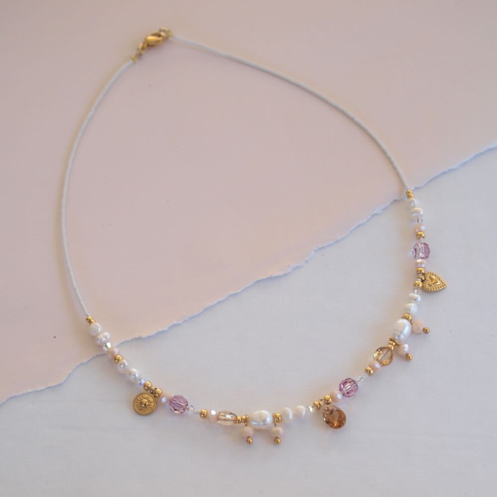 Ketting uit de Widaro collectie geregen met zoetwaterpareltjes, swarovski kristallen kraaltjes en glaskralen. De ketting heeft drie mooie bedeltjes, zoals een swarovski druppeltje en roestvrijstalen bedeltjes in de vorm van een zonnetje en een hartje. De kleuren zijn zo mooi wit, creme en een vleugje oudroze. De ketting heeft een roestvrijstalen gouden slotje. Lengte: 41.5 cm, wil je graag een andere lengte stuur ons dan even een mail of stel je vraag hieronder. Of kies voor een verlengketting aan je ketting. Op de foto zie je ook nog de ketting une a une inde nacre.