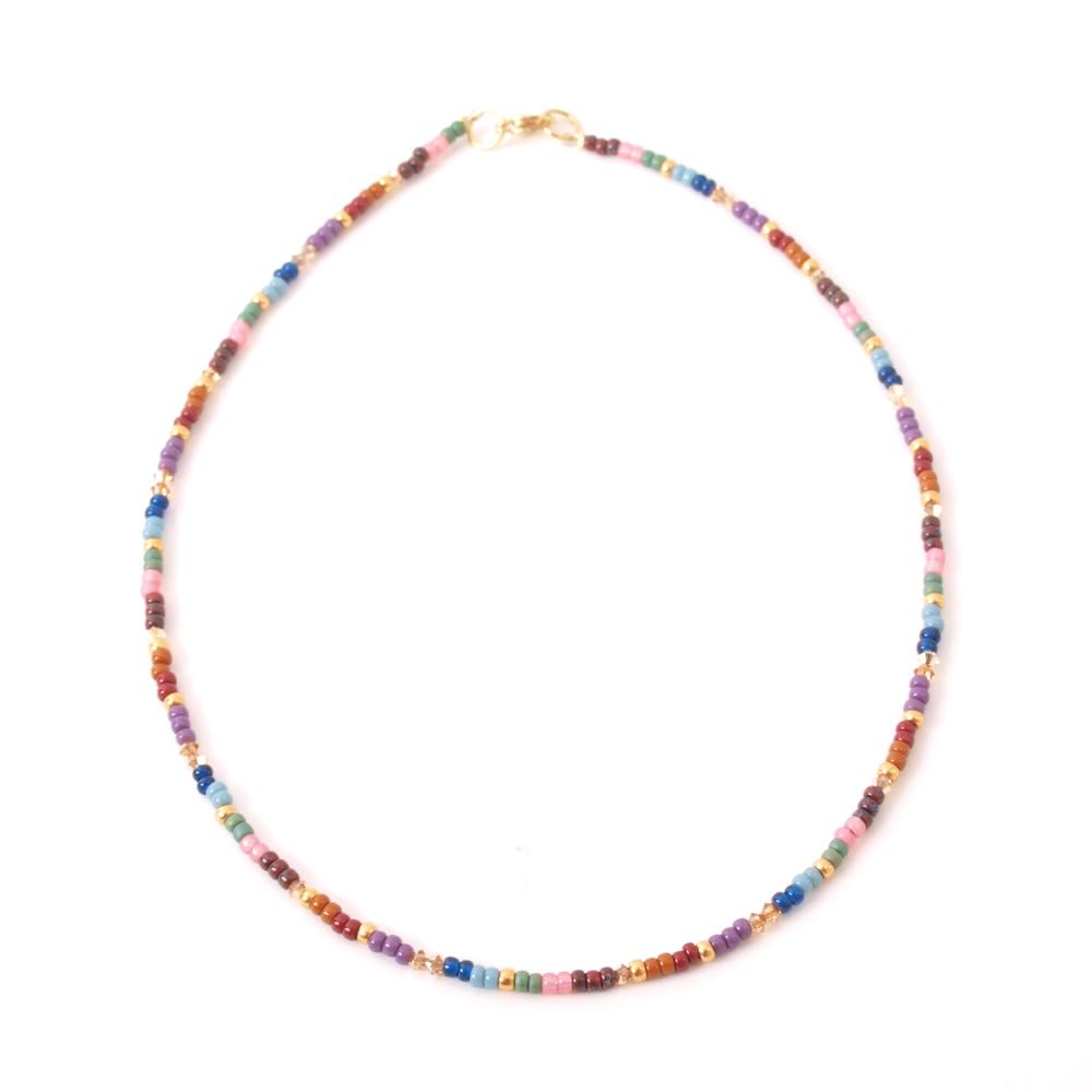 Ketting geregen op met mooie rocailles en miyuki kralen, gouden kraaltjes en kleine kristallen kraaltjes voor net die mooie schittering. De ketting heeft een roestvrijstalen sluiting en is 42 cm lang. Wil je de ketting graag met zilver of als de lengte anders moet, stel je vraag hieronder. Combineer de ketting met de more warm colors.