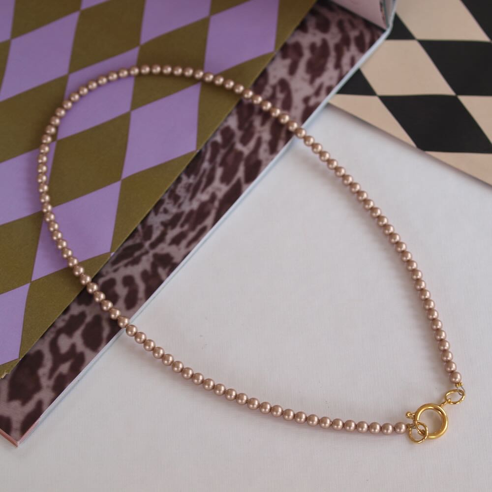 Kettingen geregen met 4mm pareltjes in de mooie kleur taupe of donkerblauw. De ketting heeft een mooi rond gouden roestvrijstalen sluiting. De sluiting kun je dus naar voren dragen en er nog leuke bedels aanhangen. Lengte: 44cm, wil je de ketting graag met een zilveren roestvrijstalen sluiting, dan rijgen we die voor jou met een zilveren ronde roestvrijstalen sluiting eraan. Op de foto zie je aan de blauwe ketting nog de natuursteen disc sodaliet blue bedel.