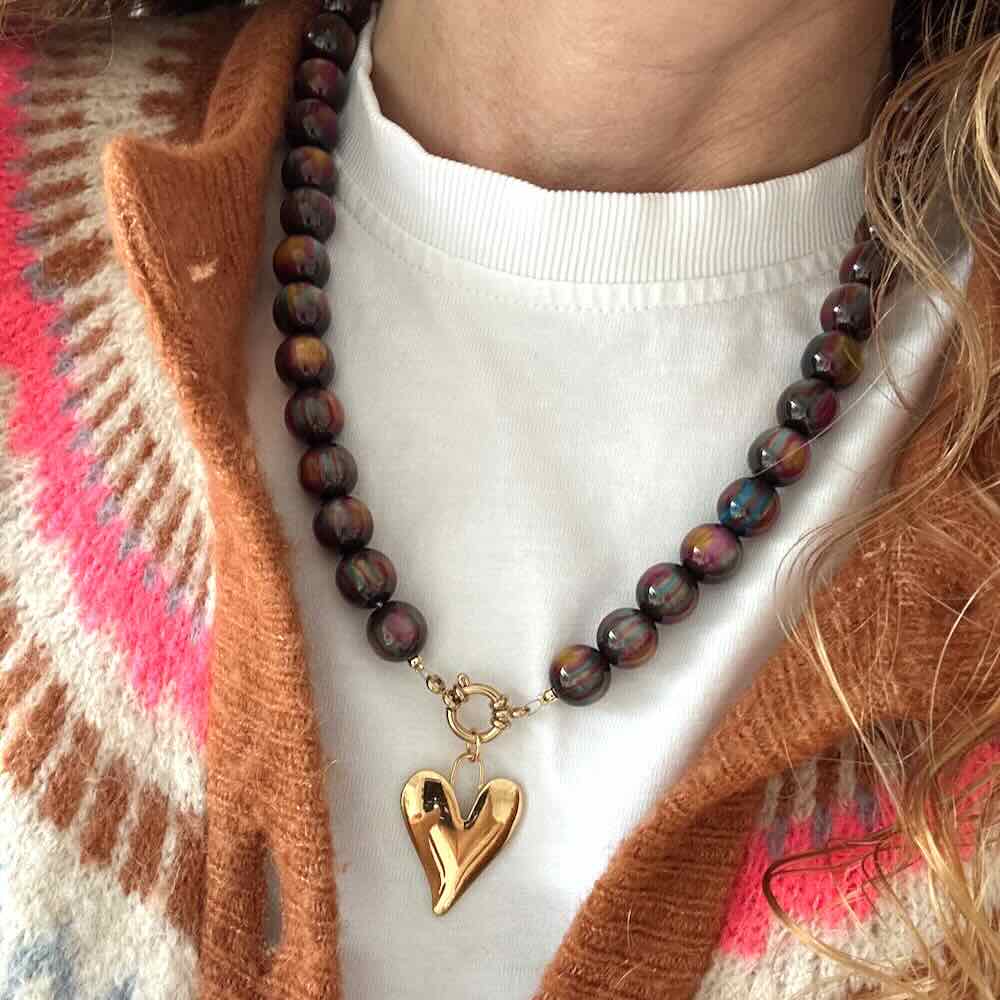 Ketting purple color is geregen met 12mm resin kralen met een glans van paars, blauw en goud. De ketting is niet zwaar en heeft een mooie roestvrijstalen sluiting. Je kunt kiezen uit een gouden of zilveren boeislot. De ketting kun je met de sluiting naar voren dragen en er nog mooie bedels aan hangen. De ketting is ook iets langer, lengte 51 cm. Wil je graag een andere lengte stuur ons dan een mail of stel je vraag hieronder. Combineer met dezelfde armband. De ketting wordt zonder bedel geleverd.